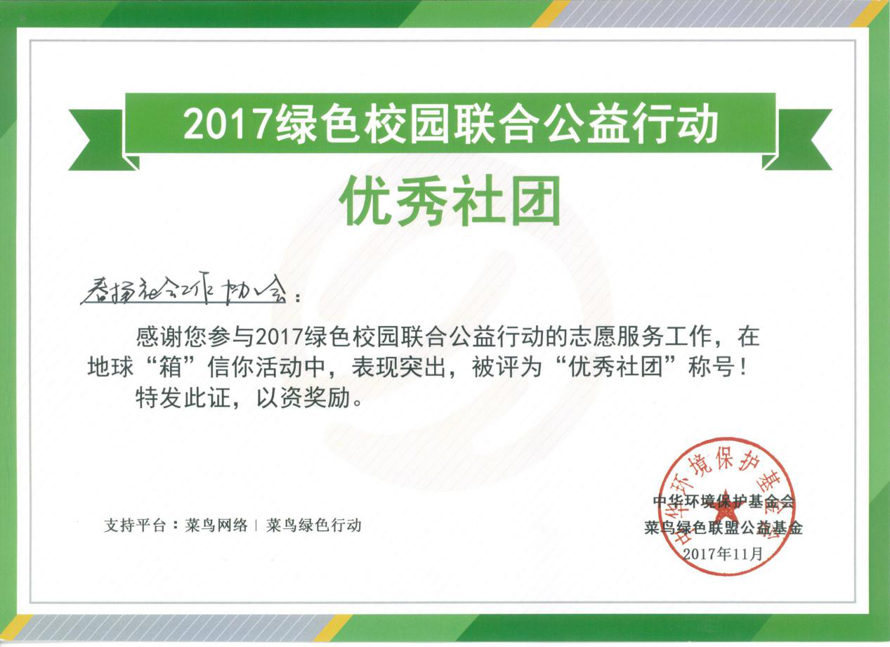 在2017绿色校园联合公益行动中,春扬社会工作协会在参加由中华环保基金会联合阿里公益基金会、菜鸟网络、一汽大众开展的全国绿色校园环保系列行动——地球“箱”信你活动中,表现突出,被评为“优秀社团”。