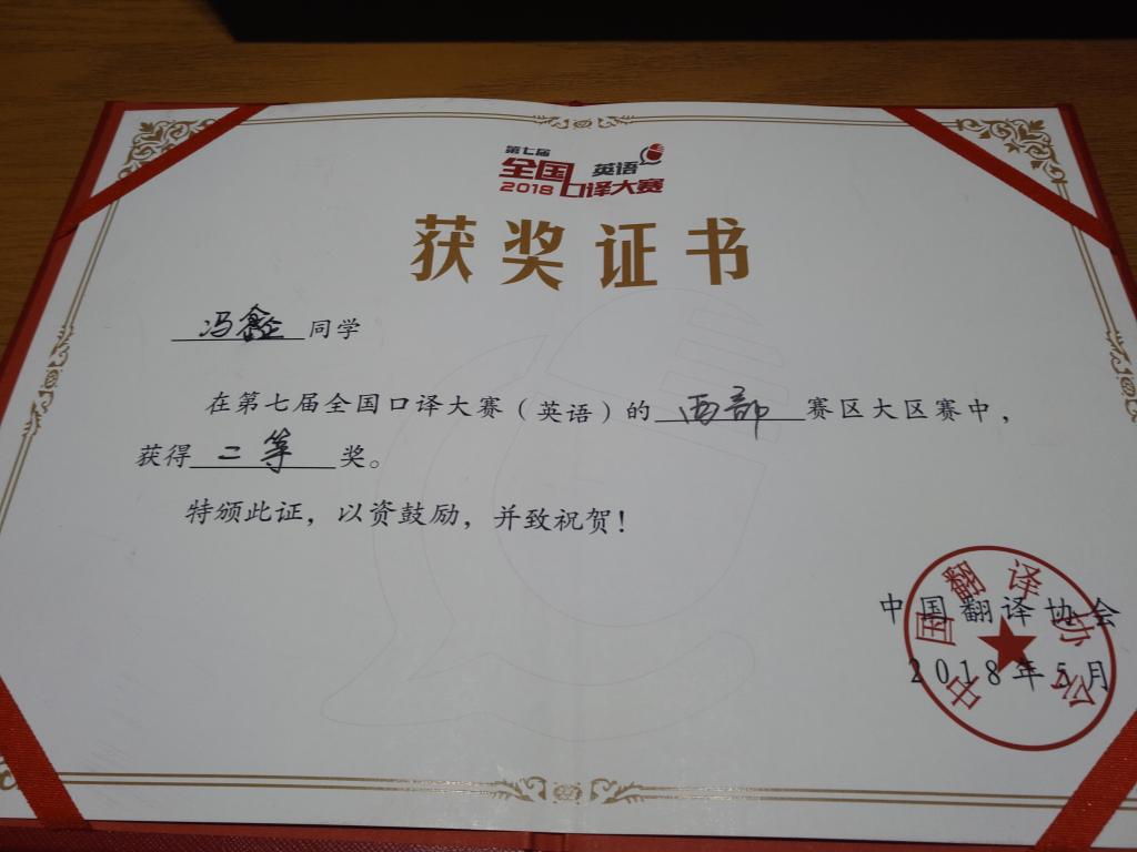 【喜报】翻译研修学院高级翻译系14级冯鑫同学在5月26日举行的第七届全国口译大赛中荣获西部赛区二等奖。同场竞技的还有来自西南交通大学、四川大学、四川外国语大学、广西师范大学、西南财经大学、西南交通大学、兰州交通大学、云南大学、陕西师范大学、西安外国语大学、西北大学、西北政法大学、西安交通大学等40余所高校的学生。