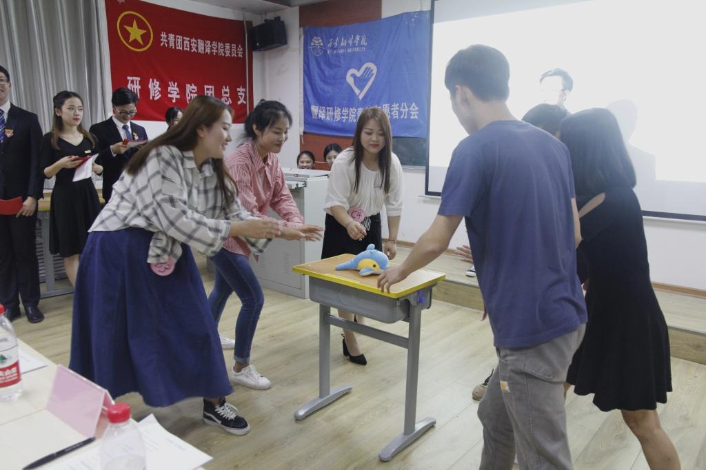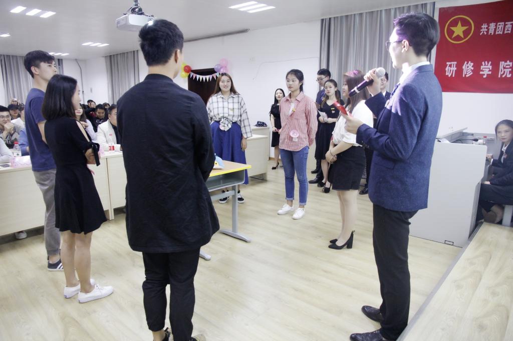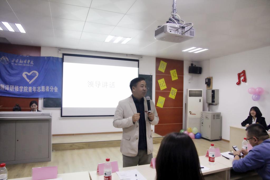 523日晚7点,由翻译研修学院青年志愿者协会主办的首届“我爱记歌词”活动总决赛在研修院  2407教室举行。翻译研修学院学工办主任蒋小军老师,亚欧语言文化学院团总支书记陈福礼老师,翻译研修学院团总支书记梅洁老师,翻译研修学院刘媛媛老师,翻译研修学院张灵云老师莅临本次活动现场。