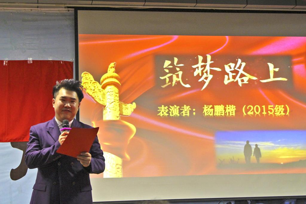 接下来,第六位演讲者是来自2015级入党积极分子杨鹏楷同学,他为大家带来演讲《筑梦路上》。《筑梦路上》既是青年对党对祖国的庄严宣誓,也呼应了习近平主席在北大讲话中对我们的要求,要爱国,忠于祖国,忠于人民,知行合一,做真正的实干家。