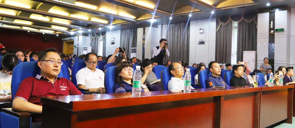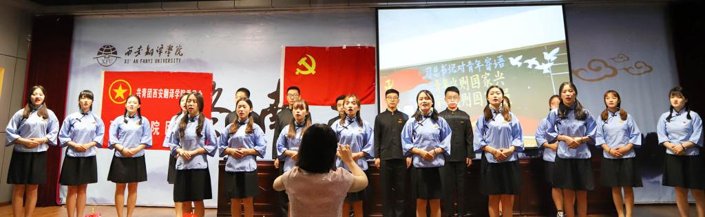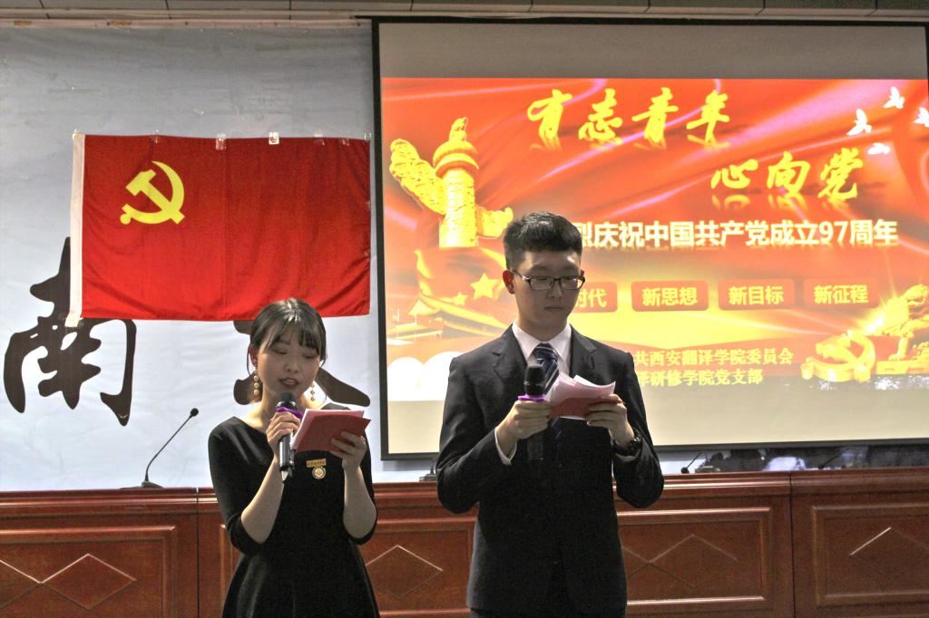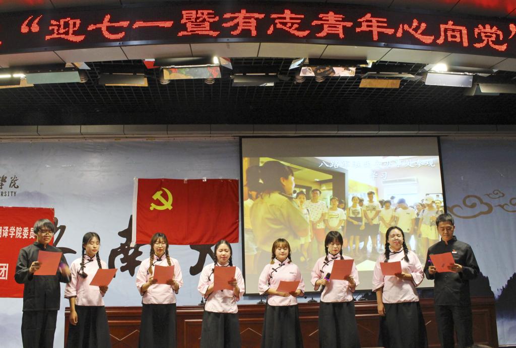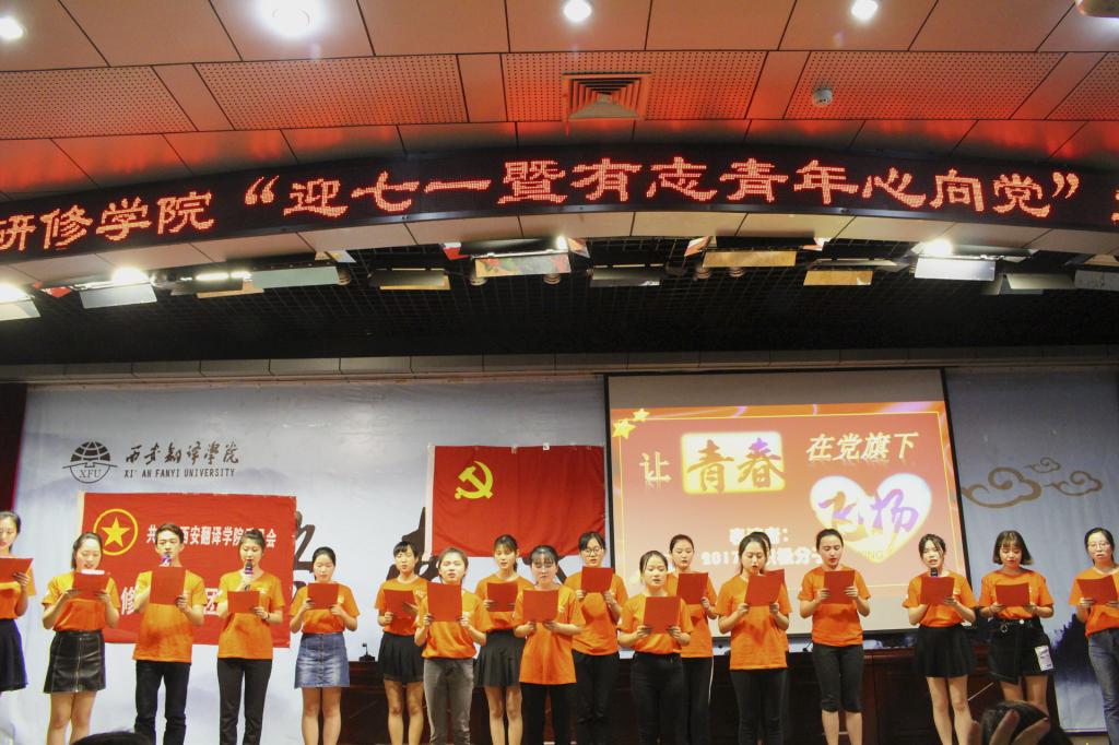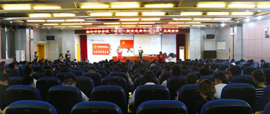 2018年6月14日下午 19:00,由翻译研修学院党支部承办的“迎七一暨有志青年心向党”主题演讲活动在图书馆终南大讲堂顺利举行。莅临此次大会的嘉宾有:西安翻译学院党委组织部部长、党委办公室主任李雪莹女士,西安翻译学院党委纪委副书记、教育学院院长王小龙,艺术学院、工党委副书记副院长康邵阳,翻译研修学院院长梁根顺教授,翻译研修学院党支部书记、学工办主任蒋小军老师,文学院团总支书记刘莎老师,翻译研修学院团总书记梅杰老师以及研修院专职教师及辅导员老师。
