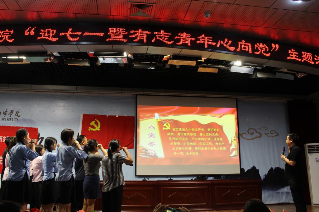紧接着,由学工办主任蒋小军老师带领全体师生、党员代表重温入党誓词。宣誓不仅仅是将右手握拳,它代表的更是一种决心,一份励志成为优秀党员的热忱!