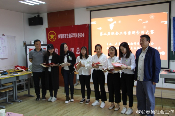 为了更好将理论运用于实践,检验同学们对专业知识的贮备。5月10日下午,由共青团西安翻译委员会主办,翻译研修学院团总支,春扬社会工作协会承办的第二届社会工作案例分析大赛取得圆满成功。翻译研修学院社会工作系薛新娅教授,学工办蒋小军主任, 辅导员杨春娟老师,院团委梅杰老师均出席本次活动。
